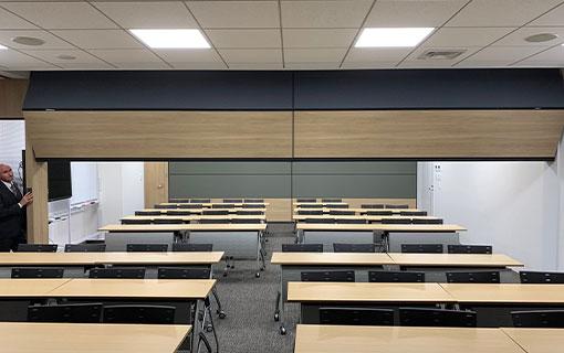 Zenith combines the vertically folding elements found in the Classic™ Series at the top portion of the wall with a slick straight down descent thereafter, which makes it the ideal flexible space solution for areas that may have wall obstructions which could limit the use of a vertically folding partition wall. With the Zenith’s narrow path of travel, you don’t have to overhaul the placement of the furniture in the space to operate the partition wall.