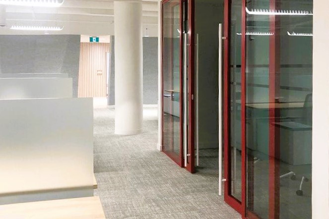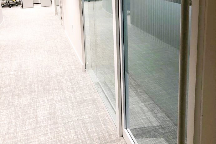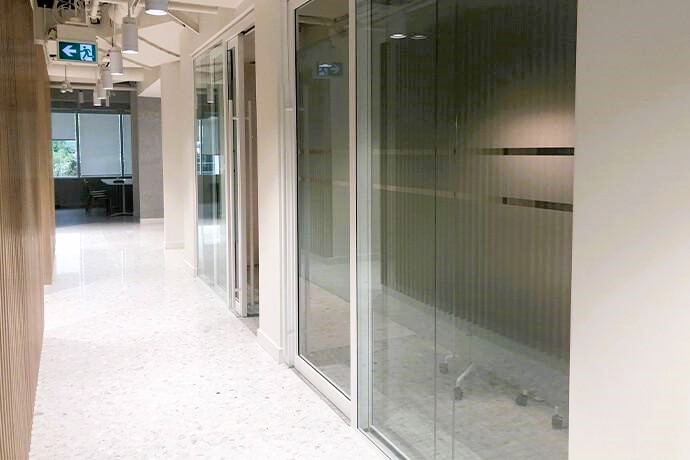 We worked alongside Matra Construction to create a bespoke look to their office in Vancouver. Over 275 square-feet of Line Systems Glass Acoustic, Six Workplace Optimization Doorset Glass Slim framed single glazed (single & double leaf) in an exquisite matte RAL 3013 finish which seamlessly slides between the two panes of glass.